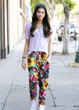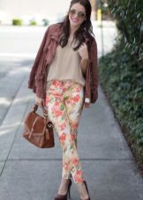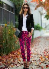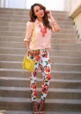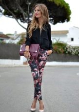- Floral trousers require a plain top, accessories, and shoes. Thus, the bow will look harmonious.
