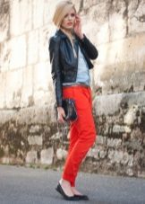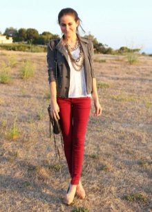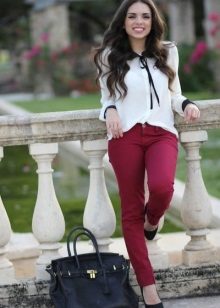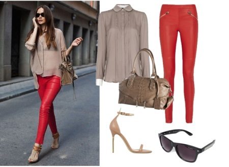 Bright red skin-tight pants in tandem with a beige chiffon blouse are ideal for creating a casual look. Sandals with heels will make the silhouette longer. A small handbag in the tone of the shoes will help to embody a harmonious image.
