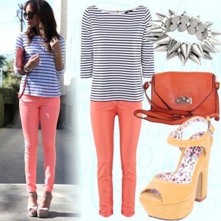 To look feminine, gentle and romantic, pay attention to the pink skinny pants. For a summer day, a striped blouse made of knitted fabric that inspires a marine mood will be a great addition. Beige thick heeled sandals and a stylish, compact one-shoulder bag are a great choice to complete the look.