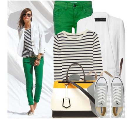 Green cigarette-trousers go well with a snow-white jacket and a striped print jumper. A bag with a combination of contrasting shades makes the look fresh and light, and sneakers, which are a very stylish detail, give comfort and convenience.