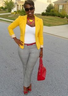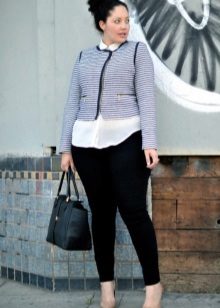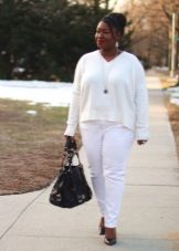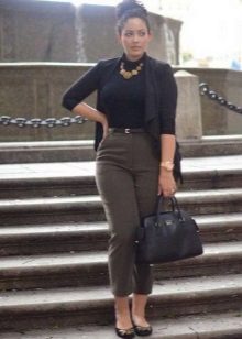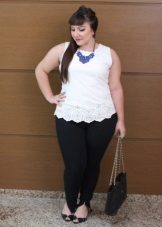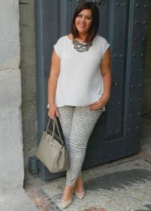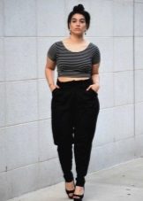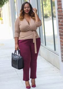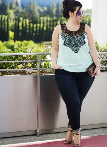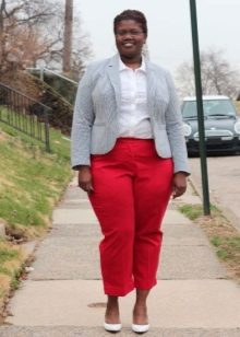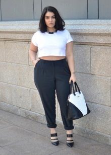 A cropped trouser model, better known as a capri, is very popular among fashion designers for overweight ones. She is able to adjust a very overweight female figure, making her more sophisticated. It is important to choose a suitable lower part of the ensemble: a plain top or a neutral blouse will make the image very harmonious and stylish.