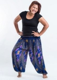 Very interesting and unusual look pants-sultanas. This model came to us from the Middle East, and it is very popular among Arab women. Since their style implies a free and flying silhouette, they hide the excess volume on the legs and hips. Often, these trousers use a floral print. When choosing a full figure, it should be borne in mind that large flowers visually significantly increase body volumes, so you should choose a picture with small buds.
