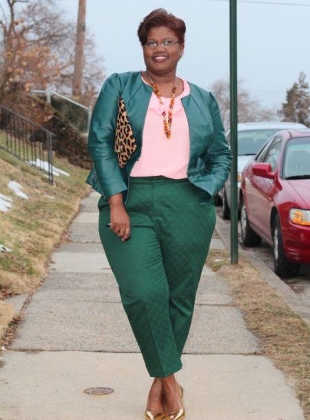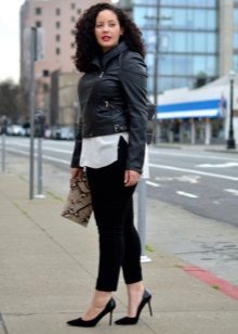 Full girls in combination with trousers must wear heels, the height of which should be chosen relative to their height.