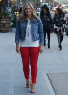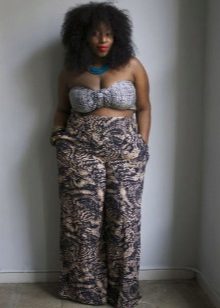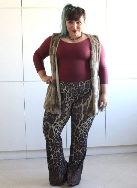 Prints on trousers can be very diverse - in a flower, peas, stripes, etc. When choosing a picture, you need to pay attention to its size - it is contraindicated for full girls to wear trousers with a large print, as it will significantly increase your image. Choose a small and merging print - things strewn with small peas or flowers look great on a large figure.