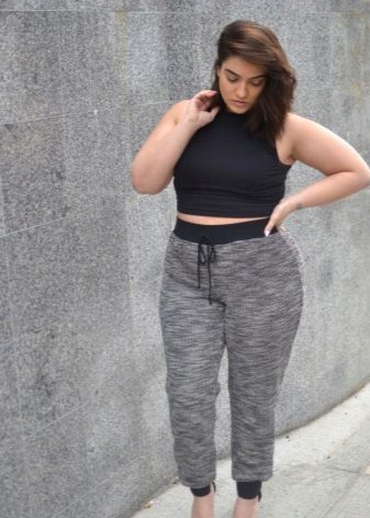 Despite the fact that sports pants involve a fit on the buttocks, they look great on full girls. This is achieved through the use in their tailoring of special fabric that visually corrects the silhouette. In addition, in some models, the material contributes to weight loss due to a special micromassage, which provides the texture of the fabric.