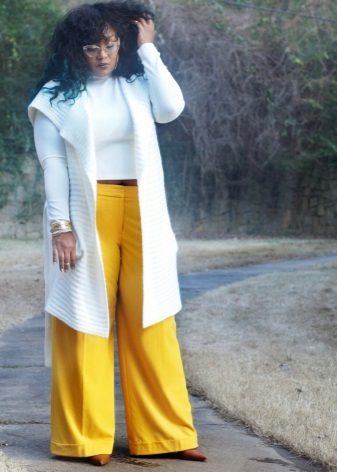 Wide trousers are perfect for those ladies who have wide ankles in their problem area. Moreover, the reason for their appearance can be associated not only with excess weight, but, say, with swelling of the legs. The width of the legs perfectly conceals these not aesthetic places and allows you to create the image of a slim and healthy woman.