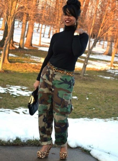 Pockets located at a level just below the knees will help balance the silhouette. Volumetric hips will not be so striking, and the waist will become a little thinner. The use of large jewelry in the image is able to “draw” attention to itself, because it will be the most striking, and, most important, large part of the image.