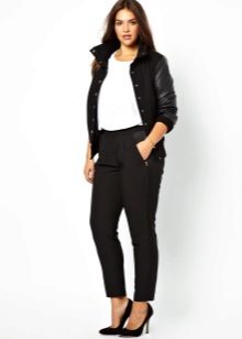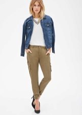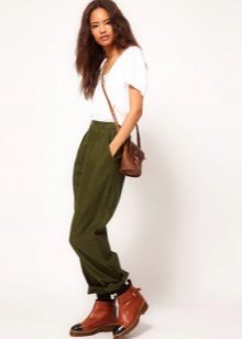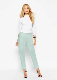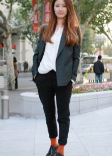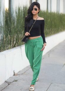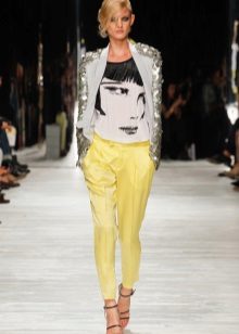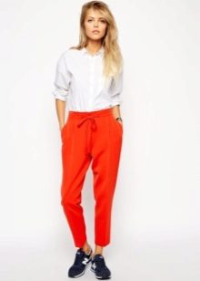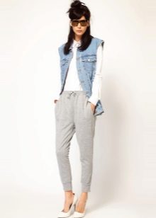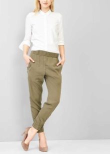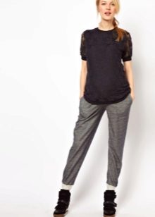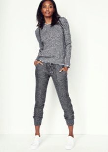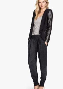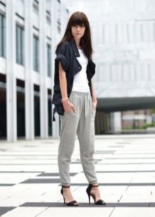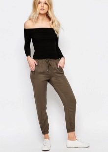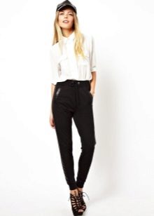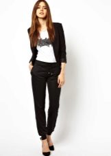 Shoes for such trousers should be any high-heeled shoes or ankle boots. In the evening look with joggers, this is a prerequisite - so that the heel is as high as possible. Elegant blouses or tops made of translucent fabrics can serve as a top. In addition, you can wear a fitted jacket. And do not forget about elegant earrings, bracelets, pendants.