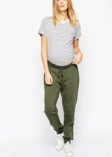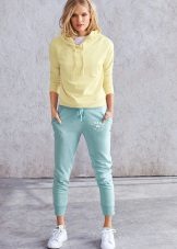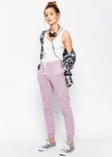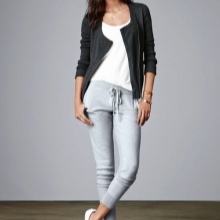 - Elastic band on the belt and on the bottom of the legs. An integral attribute is a soft wide elastic band, which serves as a belt of trousers, as well as to the assembling elements on the cuffs of the legs. Sometimes the elastic in the belt is replaced by a tie on the cord. But in trouser-legs the elastic always should be.