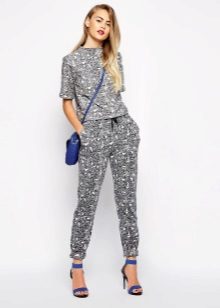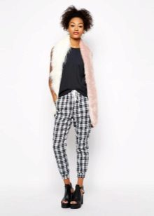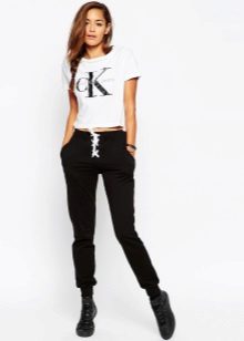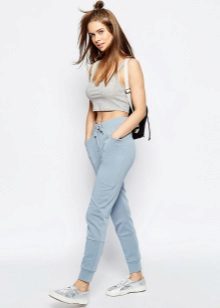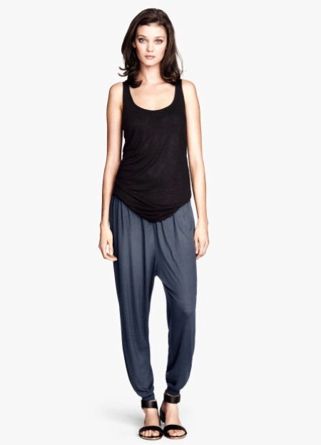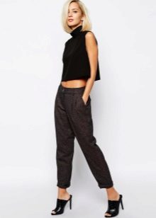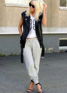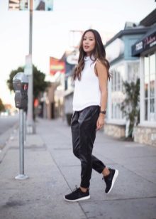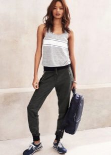 Despite the fact that clothes of dark tones are collected in this bow, such a suit is perfect for a sultry summer day. These trousers, sewn from a thin fabric, flowing in folds, are perfectly complemented by a light tank with an asymmetric cut. The culmination of the composition is stylish sandals with a wide ankle strap. One of the best options for shoes for joggers.
