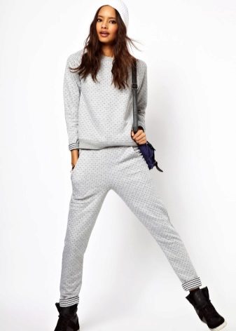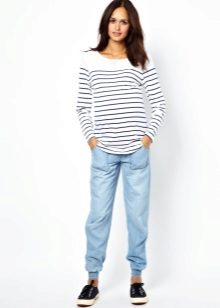 There are quite narrow models of joggers resembling leggings. Each woman can afford such trousers, but the top must necessarily cover the body from the waistline to the middle of the thigh.