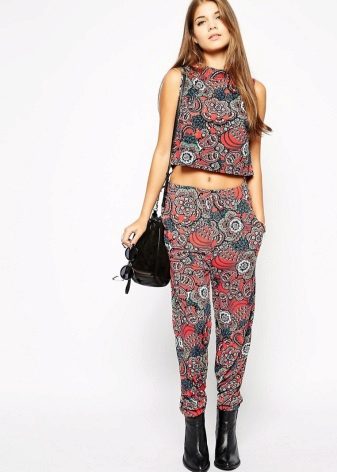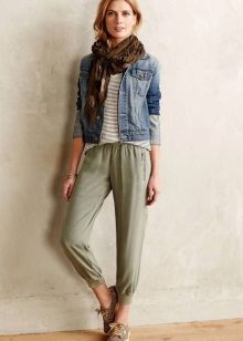 Summer variations of joggers that fit perfectly into the casual style are made of lightweight fabrics, such as cotton (volta, cambric, muslin, chiffon, etc.). They are not afraid of the summer heat, in addition, they look very appropriate in combination with other items of clothing that are characteristic of this time of year.
