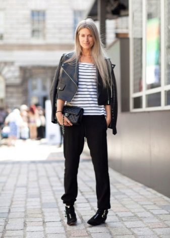 For business style, there are models of joggers made in more strict (costume) colors and made of dense fabric that holds its shape well. More elegant variations are possible. For example, many designers like to decorate joggers with side vertical stripes. There are also models using lurex and other bright decorative elements. Such options are already appropriate at a cocktail party or other festive event.