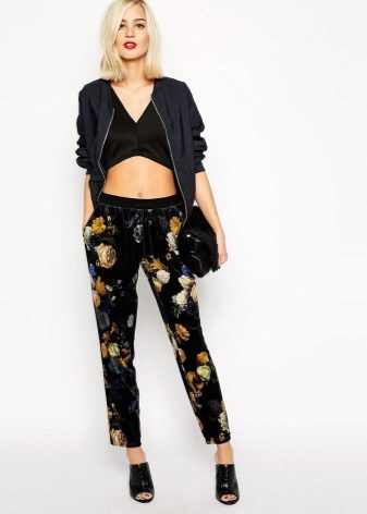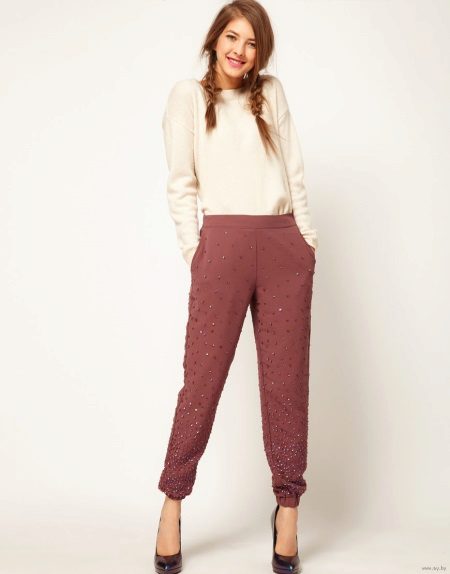 Solemn events require appropriate fabrics and styles. Such joggers should keep their shape well, that is, be made in dense fabric. Elegant elements are allowed here: sequins, ribbons, beads, rhinestones, sequins and so on. It is important to remember that the brighter the decorative elements, the more restrained and darker the color of the trousers themselves should be.