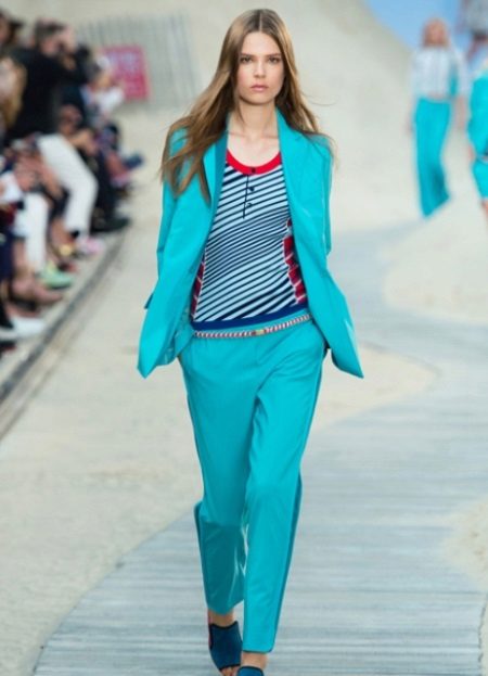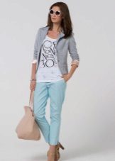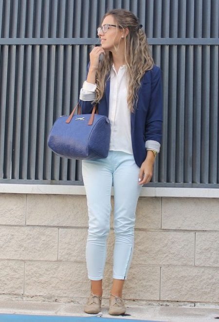 A deep jacket and light blue trousers will create a casual look. Dilute it with a white classic blouse.