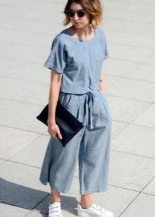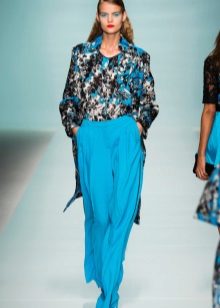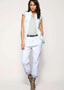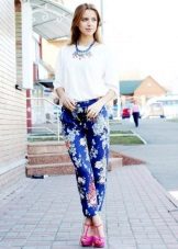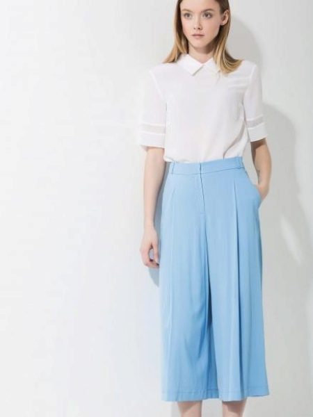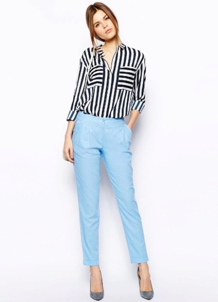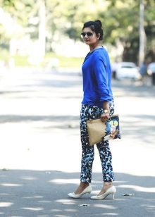 For a casual look, a shirt blouse will also be interesting. You can choose it to match the trousers, for example blue or with a floral print in combination with white shoes.