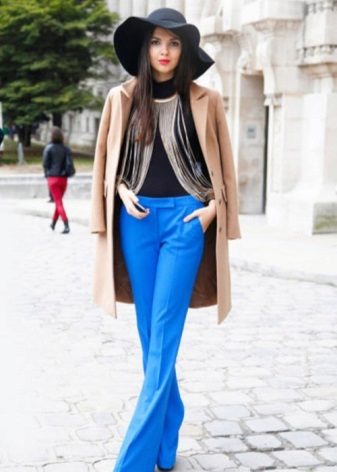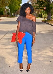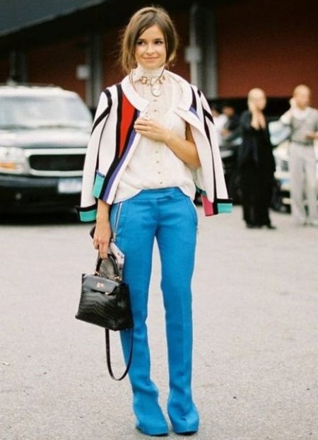 A combination of white or black with blue trousers will help create a business style. For bold onions, choose a yellow, orange, or red top.