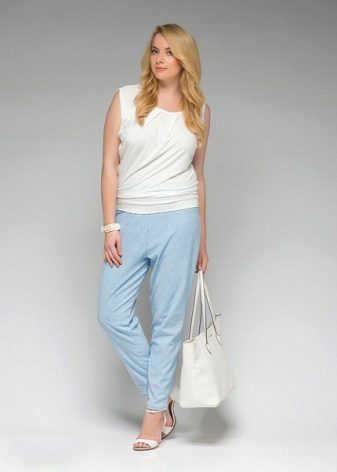 If a girl with magnificent forms decided to wear such trousers, then it is better to combine them with a voluminous top, it is better to do this with the help of a tunic.