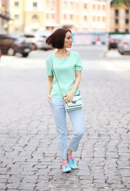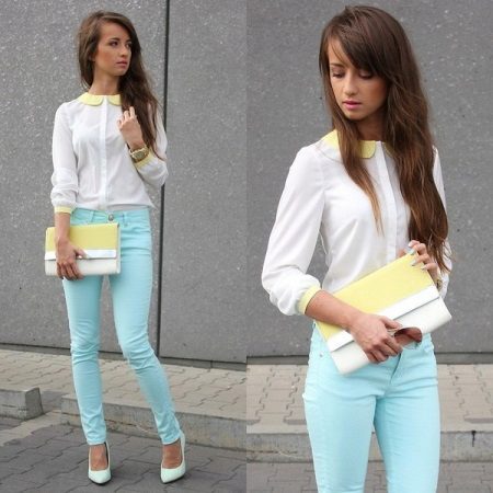 Contrasting shoes or heeled sandals will help you create a vibrant and expressive look. For example, choosing a white sweatshirt and trousers of azure hue, focus on the shoes - choose yellow shoes.