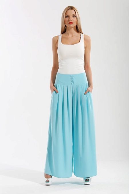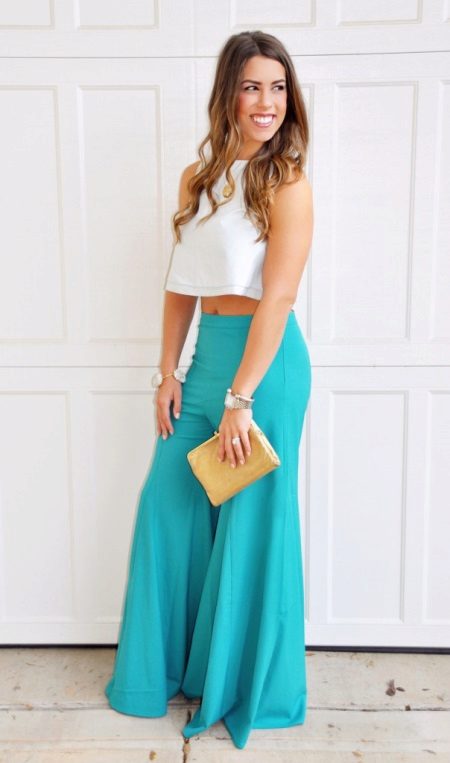 Palazzo trousers (wide) on a leather belt in combination with a top will make you bright. Wear high heel shoes, a bag in bright colors will turn your bow from everyday to evening.