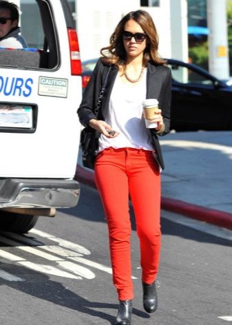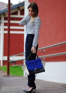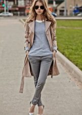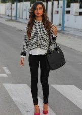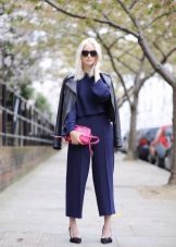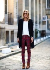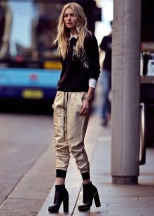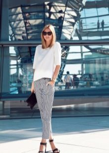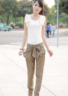 Chinos. They look like pipes, but differ in style - they are not formal, they fit perfectly into the casual style. Their distinctive features: free top, narrowed and shortened bottom. Chinos can be combined with classic blouses and shirts, as well as hoodies, t-shirts. There are no restrictions in shoes either.