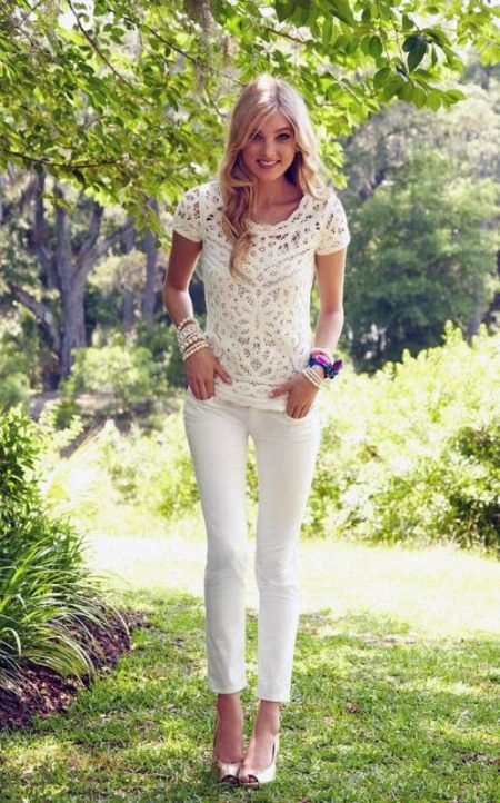 The most popular models of cotton trousers are narrowed and straight with white or beige arrows. They combine perfectly with blouses, tops, jackets and jackets, suitable for an office look.