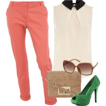 A delicate date bow with muted coral trousers is combined with a white blouse and a beige clutch. Green shoes make a bright accent, you can add a small bracelet in green colors.