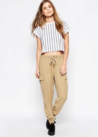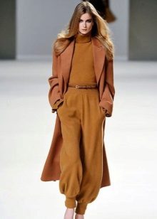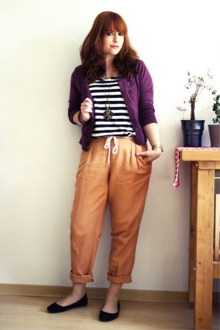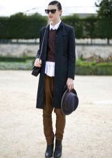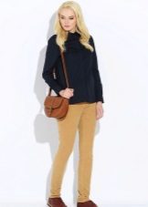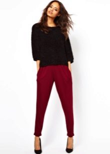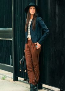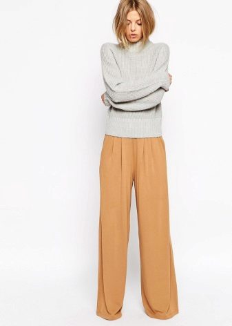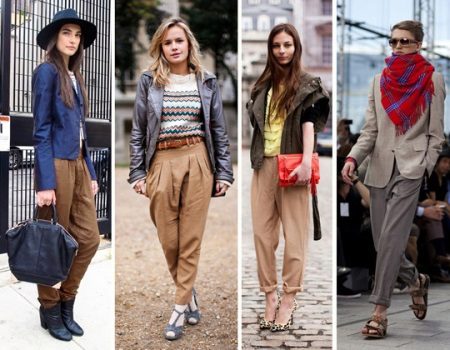 In cool weather, jackets, knitted cardigans, jackets are suitable. As additional accessories, scarves in the tone of the pants look original or a few tones are brighter or darker, large bracelets. Shoes for cool weather - ankle boots, high boots with buckles.