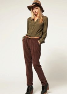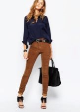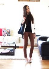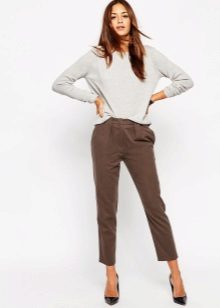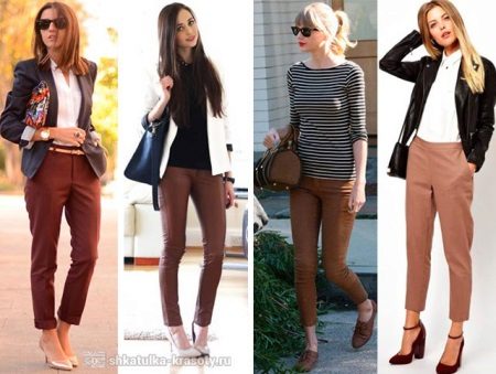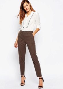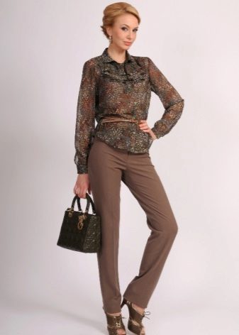 Brown pants are an ideal option to replace such a basic element of the wardrobe as black pants for the office. It is better to choose straight pants or flare pants with arrows. We select a classic shirt or blouse for them, colors - gray, black, ashen. A tight sweater is also suitable for the top.