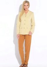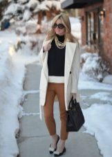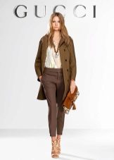 - The classic look. Cropped trousers with arrows, a tone of coffee with milk. Combine with a black and white blouse. Top white coat in a classic style. Shoes - ballet shoes. Of the accessories - combined white and gold beads.
