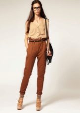 - High waist pants. We create the original image using trousers with a high waist of red-brown color, we select the top in the same color scheme with the bottom. In this case, a beige sleeveless blouse. From shoes - wedge ankle boots. Dilute the image with black accessories - a black strap, bag, glasses in a black frame.
