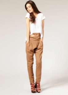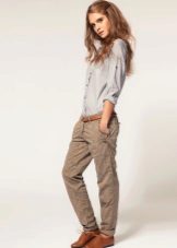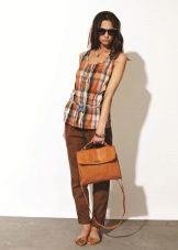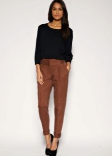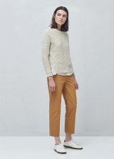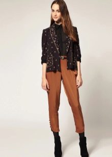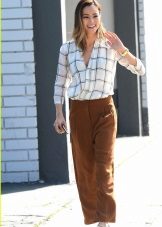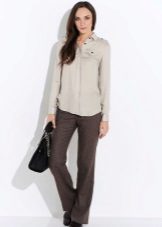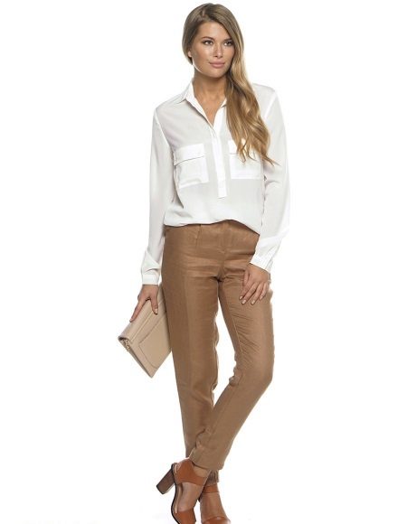 Under brown trousers, you can wear blouses and shirts of any cut, fitted and loose cut. A feminine top looks from light flowing fabric - tops, blouses, tunics. falling from the shoulders, or fully opening shoulders. Colors - white, black, pastel colors, beige, gray.