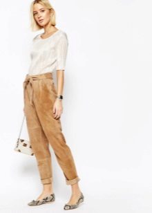 - Brown leather trousers + white blouse. Leather skinny pants with a classic white loose blouse. Stylish brown sandals with a steady heel. We complement the image with gold accessories and a bag-clutch in sand color.