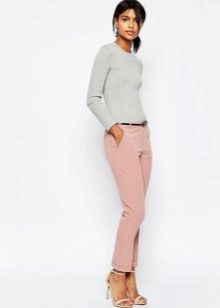 - Everyone's favorite skinny pants, pipes and skinny. Ideal for slim girls whose parameters are close to model. Such a style will only emphasize the figure. Can be worn with high-heeled shoes to visually lengthen your legs.