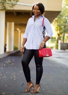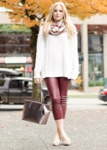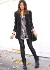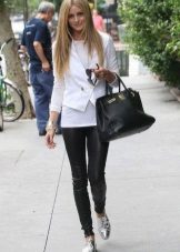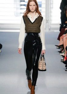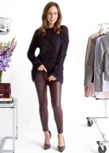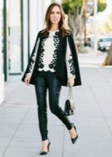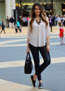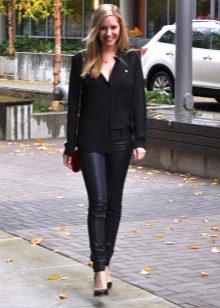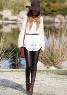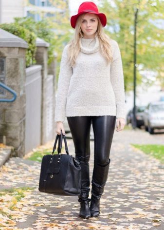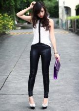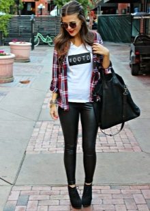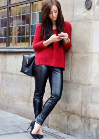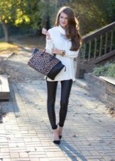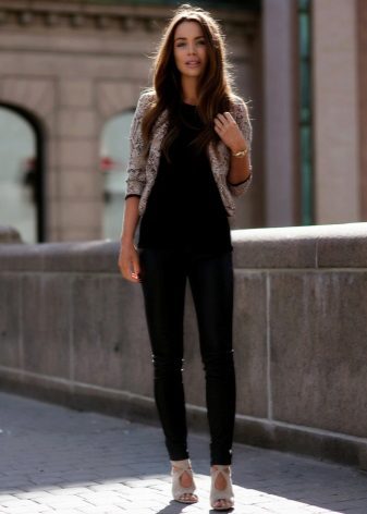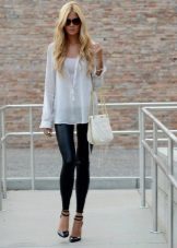 Leather leggings look good with a leopard print. For black leggings, a white top will work. It is worth remembering how textures are combined: brilliant models are best muffled with matte cotton, matte ones should be decorated with silk or satin.