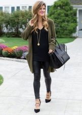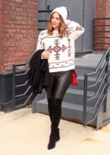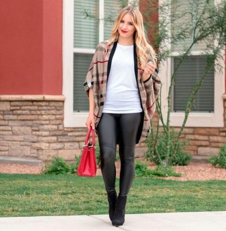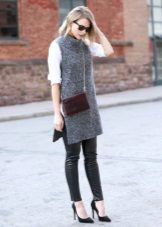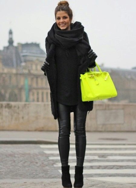 Leggings are now worn only with clothing that chastely covers the hips and does not hug the upper body very tightly. Ideal options are long knit sweaters, classic or knitted cardigans, various jackets, fur coats. In summer, chiffon tunics, t-shirts and shirts will do.