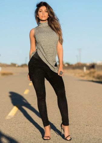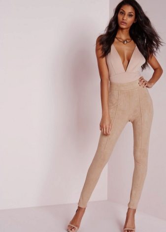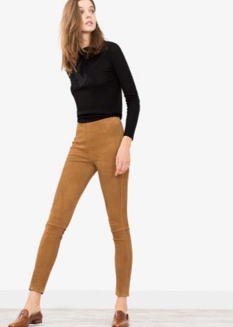 Suede pants are a very interesting option, and not in black. Dusty pink, gray, beige and other pastel shades - these are the best colors for such clothes. However, there is a minus in suede leggings - they are suitable only for owners of slim and beautiful legs, as they emphasize the shortcomings.