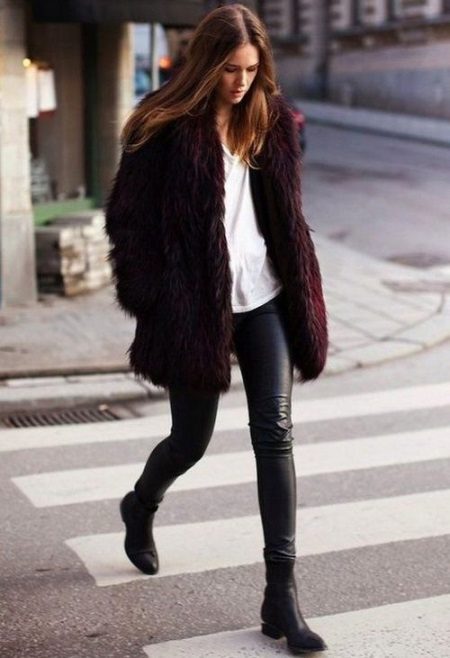 Autumn option: flat shoes, semi-matte leather leggings, a fur coat.