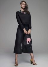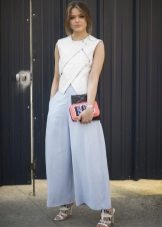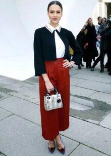 Since the trousers themselves are quite voluminous, bags for them usually choose small but roomy ones. It can be an envelope bag, a trapeze, a bag, etc. With culottes, both long-strap bags and models with a handle go well.
