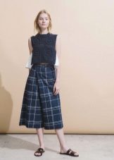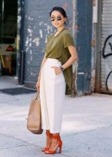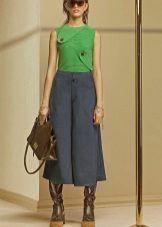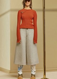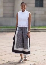 Outwardly, they resemble a cross between short wide trousers and a straight skirt. Usually these are trousers with a high or medium fit and flared trousers just below the knees. However, the length of the legs can vary, as well as the fabric from which the culottes are sewn.