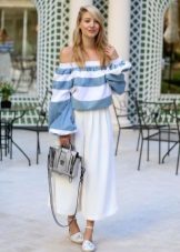 - Shopping: blue denim culottes, striped top with long sleeves, revealing shoulders, a capacious brown bag and matching sandals.