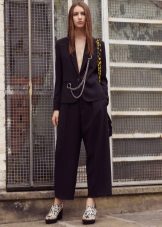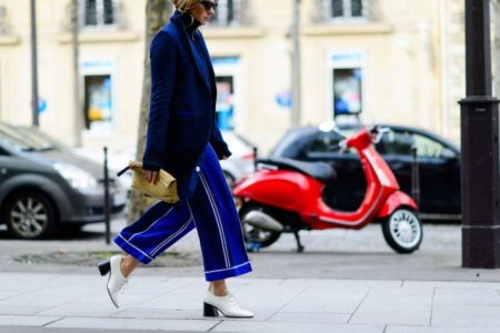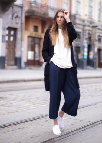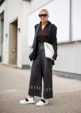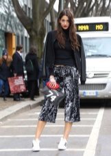 For those who are not afraid that fashionable culottes will visually make them a little lower, stylists recommend wearing such trousers with comfortable sneakers or slippers, heeled mules, narrow, high boots (in this case, the legs will cover part of the bootleg), and various oxford shoes, loafers, gladiator sandals, etc.
