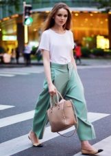 - For study: elongated culottes of mint color, a white blouse with a short sleeve, light ballet shoes and a bag of the same shade.