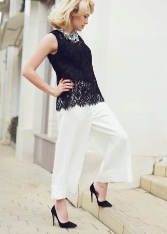 - On a date: snow-white culottes combined with a lace black sleeveless top, black classic boats and a massive necklace.