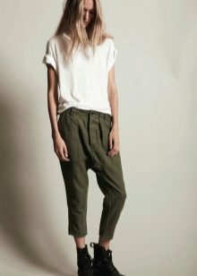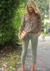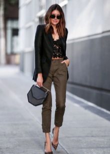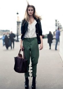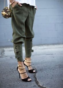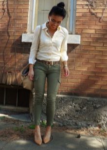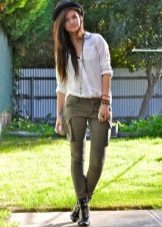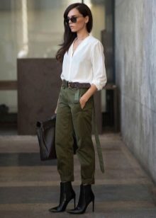 The olive color is in fashion this season. Therefore, if you want to buy pants in the style of military, give preference to him. Like jeans, olive-colored trousers can be worn with anything. In everyday looks, a bright t-shirt or jacket is the ideal solution.