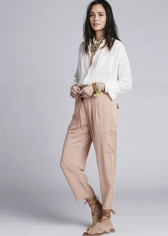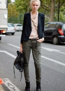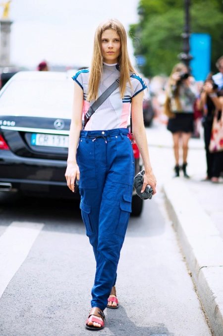 Usually military-style trousers are called cargo. Their distinguishing feature is an unusual set of pockets for us. They are located not only in front and behind, but also on the sides of both legs. In the classic interpretation, the trousers are quite baggy, but today designers offer us tight models that perfectly emphasize the figure.