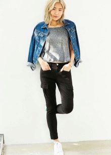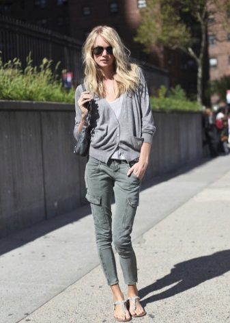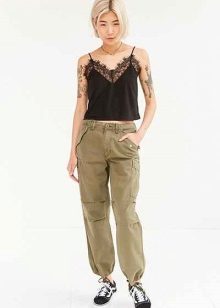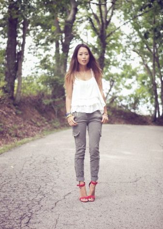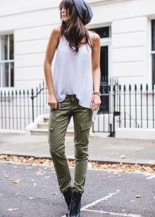 Military-style trousers go well with any casual or sportswear. In this case, the color scheme should be neutral - white, black, gray or beige.