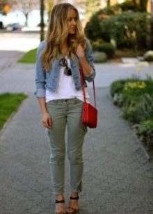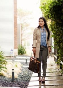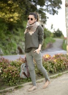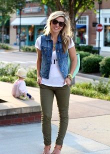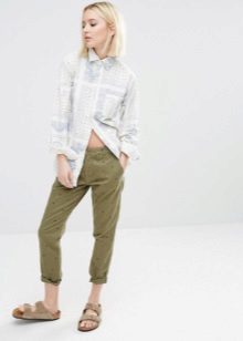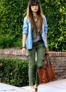 It is not necessary to buy khaki pants, for a casual look, a blue model is perfect. Wear them with an interesting T-shirt or turtleneck and flat shoes. For the summer, you can pick up sandals or slippers, and in the fall replace them with sneakers.