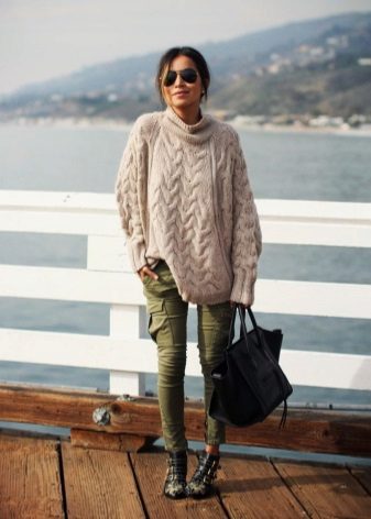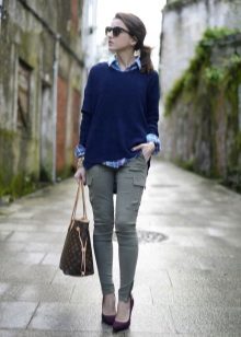 In autumn, wear military pants with voluminous cozy sweaters. Under a sweater, you can put on a checkered shirt to make the look light and laid-back. But if you complement the look with high heels and stylish jewelry, you get a great business look.