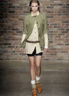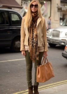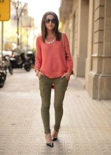 Another trend is layering. You can support this fashion trend and wear military-style trousers with several “layers” of clothing. It can be a T-shirt, sweater, jacket and a voluminous scarf. Each subsequent layer should be visible from under the previous.